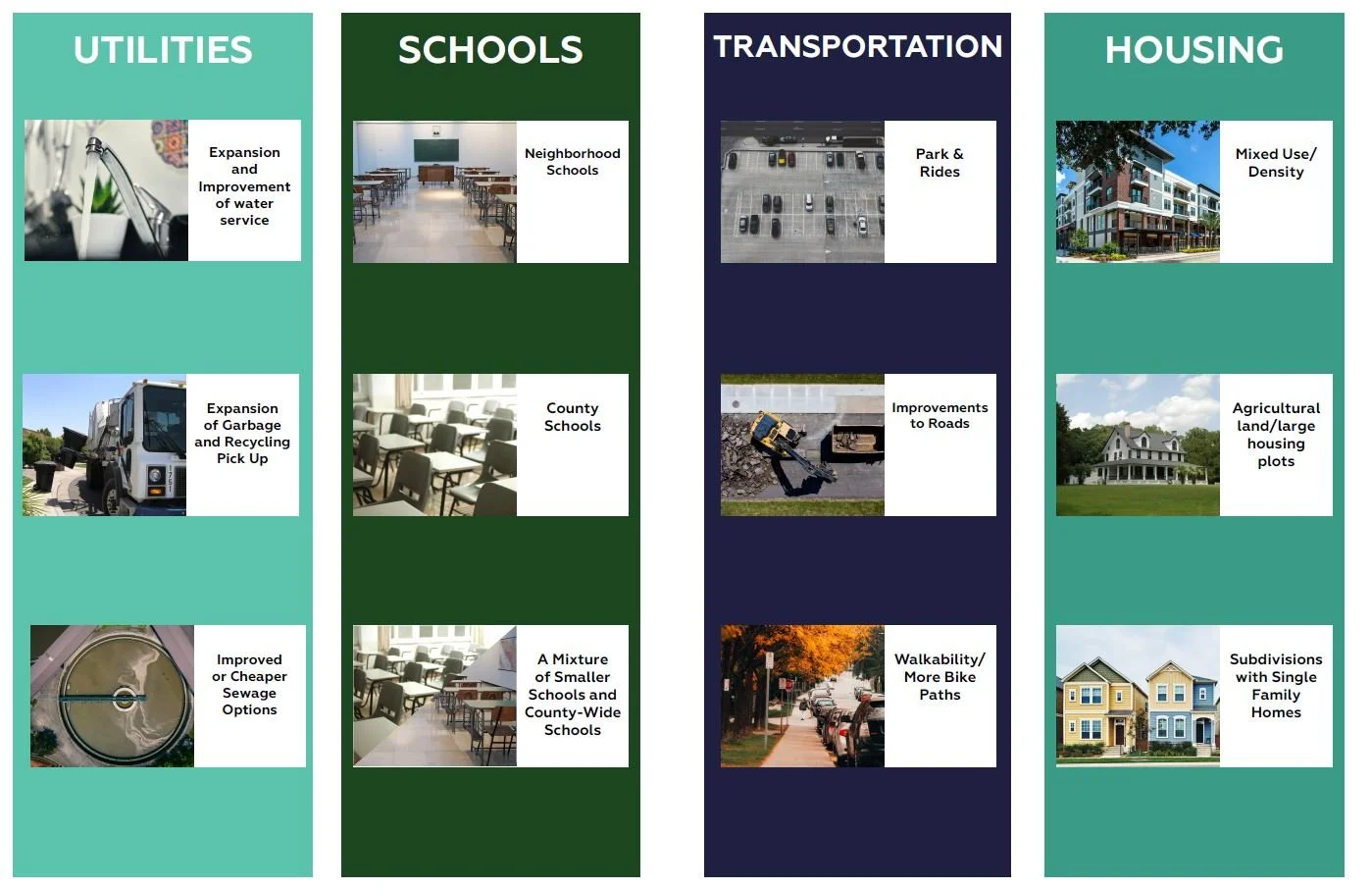 Community engagement was at the forefront of this project and included many opportunities for the county to hear from its residents and business owners. We hosted two open houses, stakeholder and steering committee meetings, and designed an online portal for virtual engagement. My role in this project was to design assets for our open houses and virtual engagement portal, including voting games to better understand community sentiment. I also facilitated both open houses with a small team.